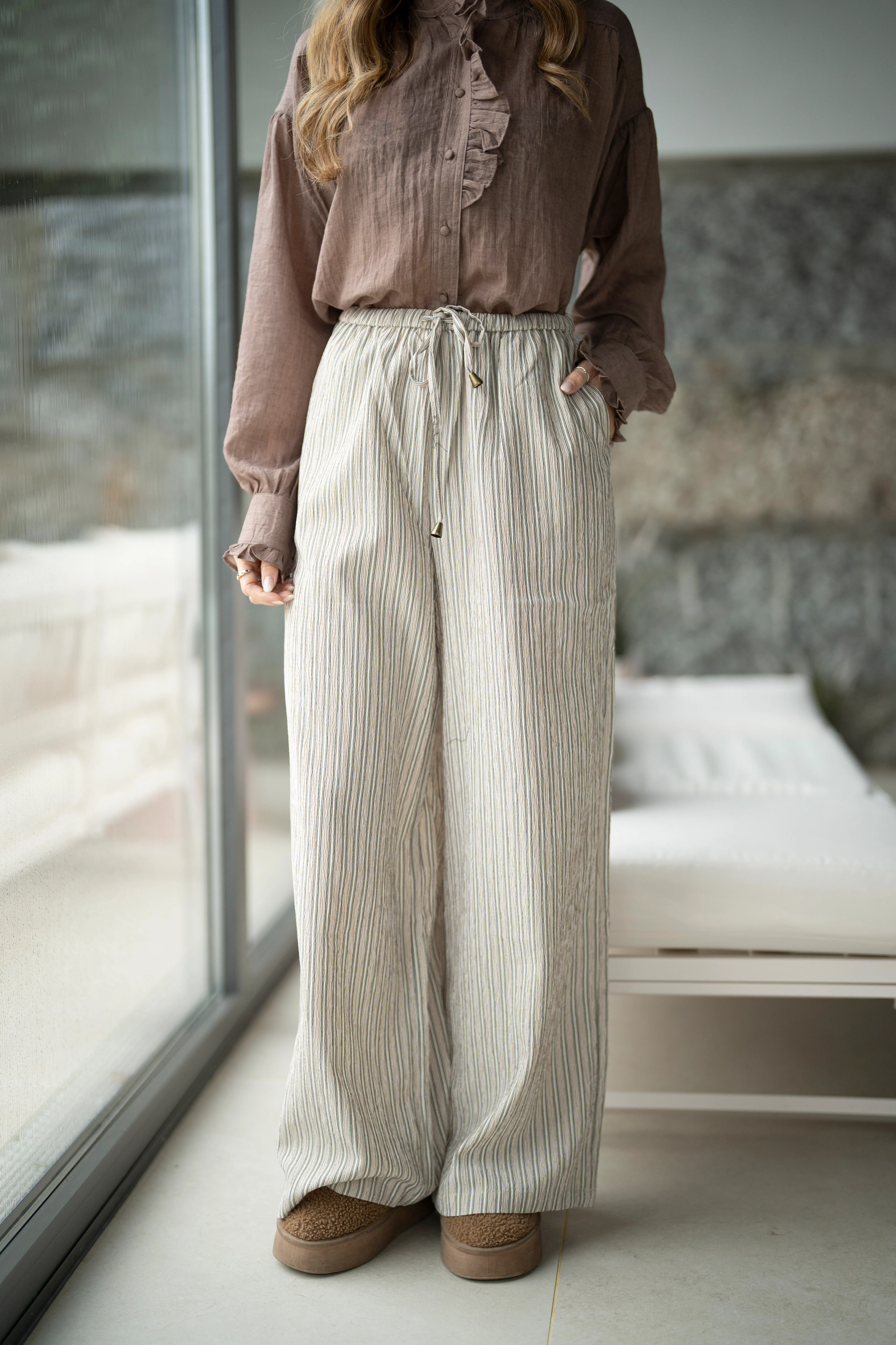 - Calças com elástico na cinta.
